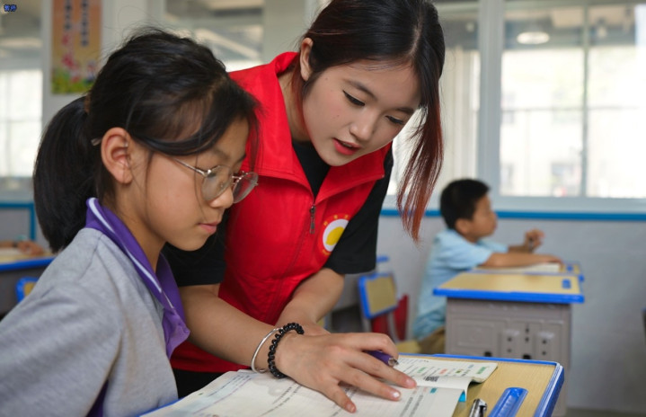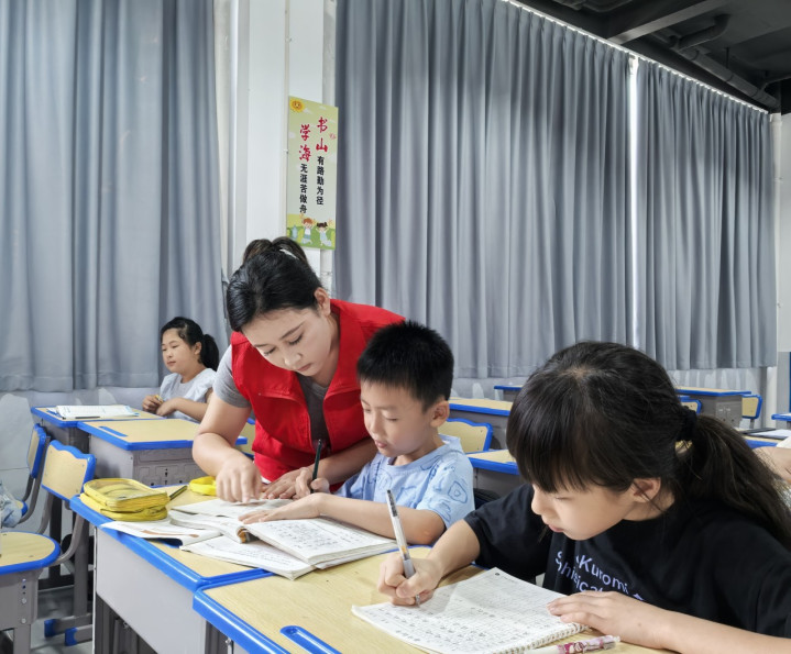 大学生志愿者给学生辅导作业。